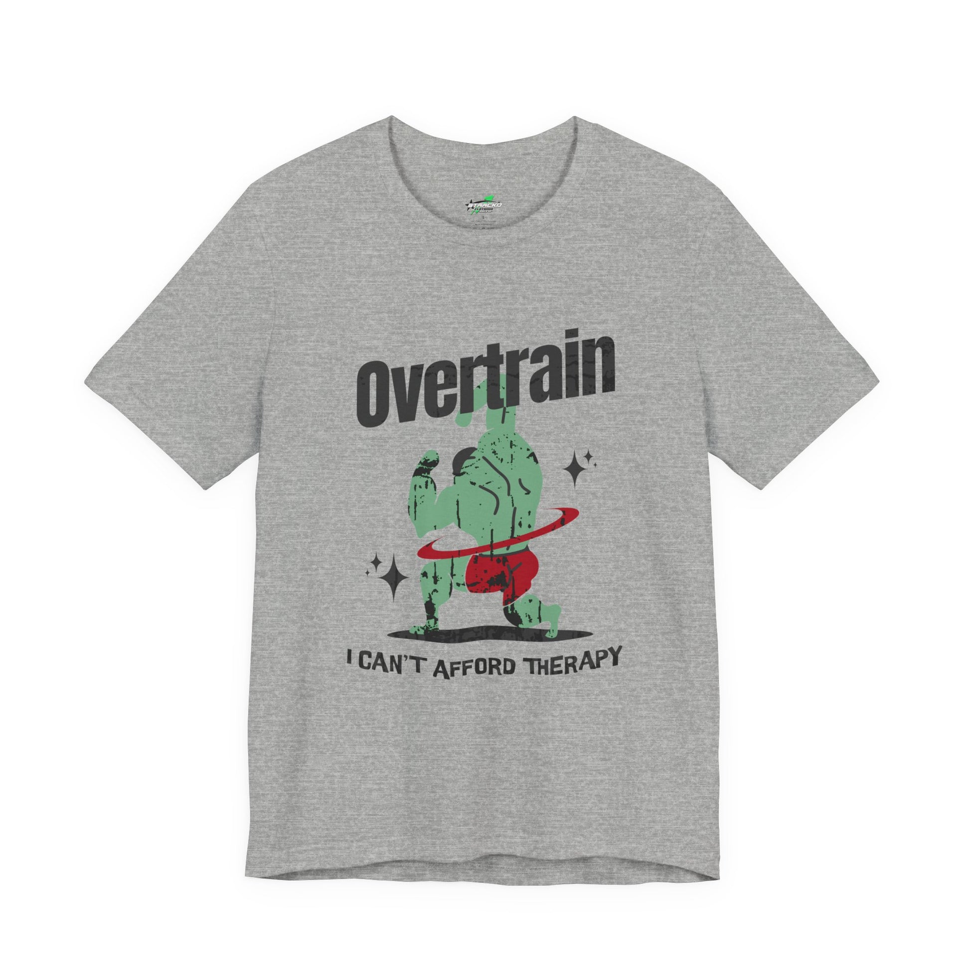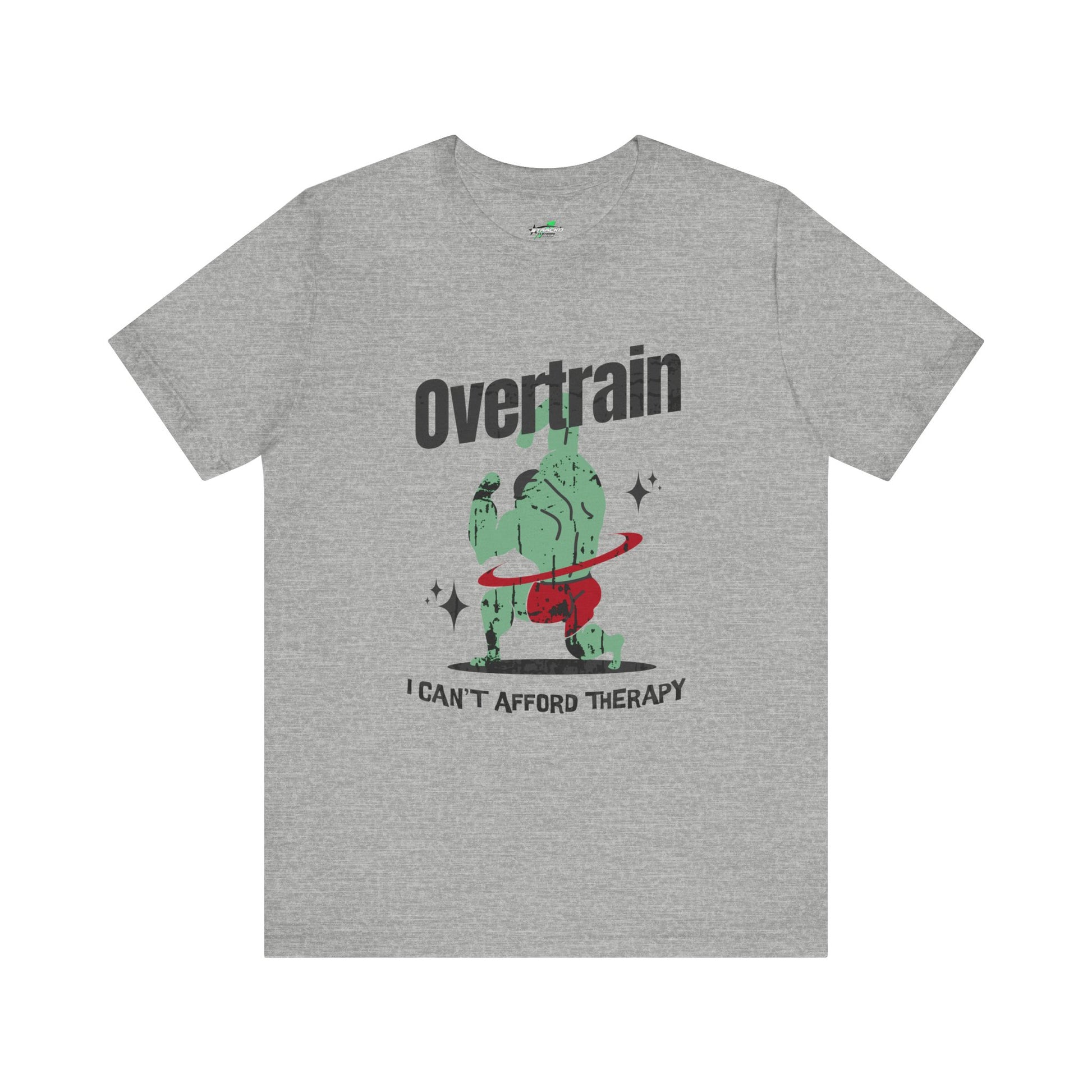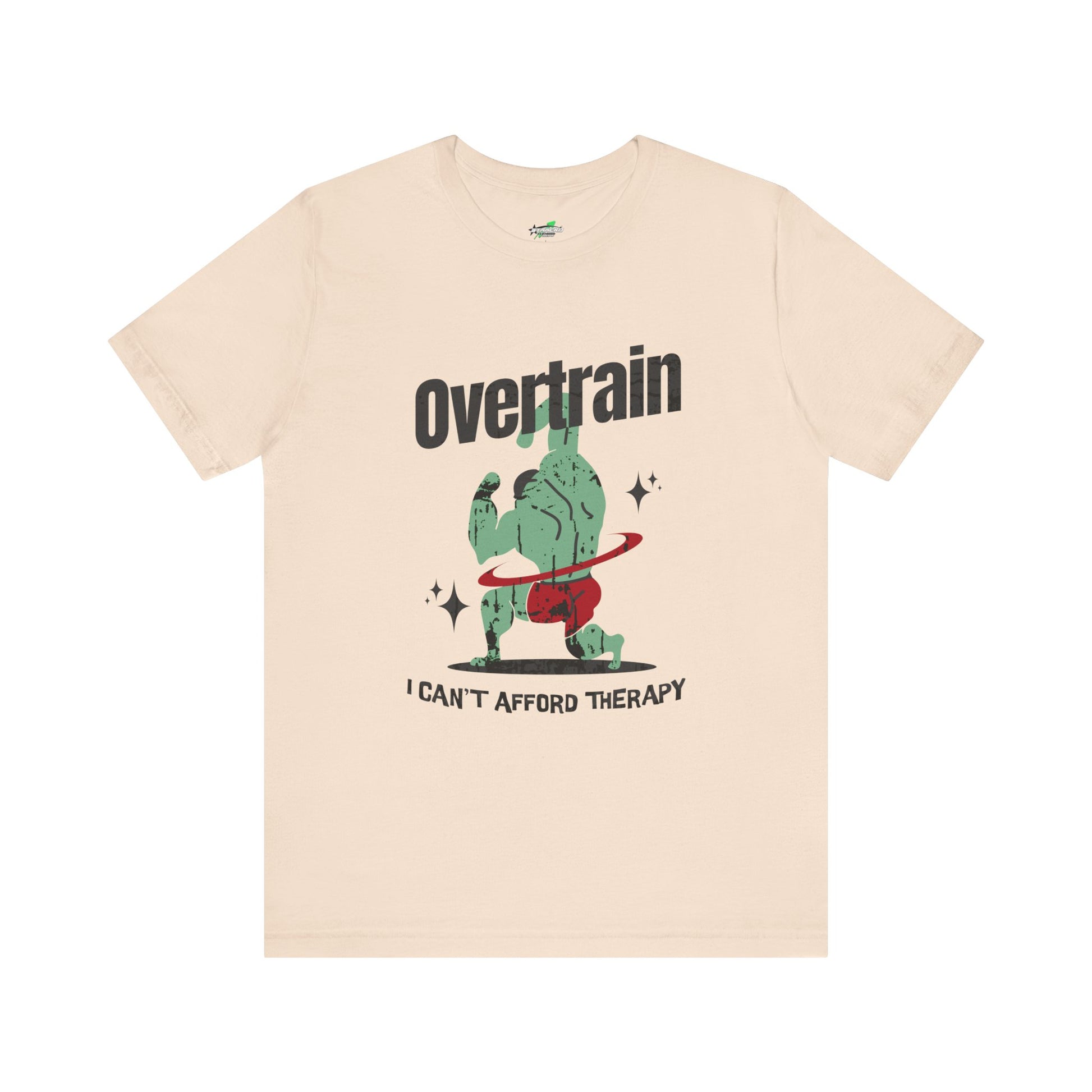 This humorous T-Shirt features the phrase 'Overtrain i cant afford therapy'. It is perfect for those who have a sense of humor and enjoy casual wear. Ideal for fitness enthusiasts or anyone looking to add some fun to their wardrobe. Suitable for everyday wear or as a gift for a friend who loves to work out.